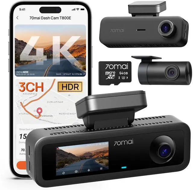 4K Ultra HD 3 Channel Dash Cam Front and Rear InsideThe 70mai dash cam T800E is a 3-channel car camera 4K front, 1080P interior, and 1080P rear capturing every angle in crystal clarity. With ultra-wide lenses and F 1.55 aperture, this dashboard camera delivers excellent visibility day and night, ideal for Uber, Lyft, or family drivers seeking total protection ^^ Night Vision & HDR Technology + Switchable IR for Interior CameraEquipped with advanced HDR imaging and 3D noise reduction, this car dash cam ensures sharp footage in low-light or nighttime conditions.