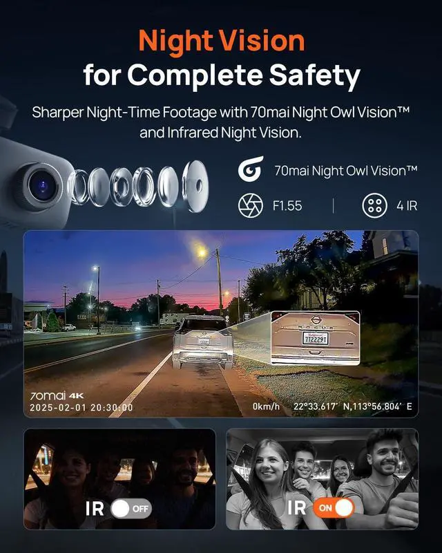 The 70mai 4K dash cam front and rear captures license plates and road details clearly, day or night. The interior camera features switchable infrared recording, allowing you to turn on IR for even clearer night footage inside the vehicle, or turn it off when not needed ^^ 24/7 Parking Monitoring & G-Sensor Emergency LockWith parking surveillance and G-sensor collision detection, this dash cam front and rear 24/7 recording system protects your car even when parked. It automatically records incidents and locks footage during impact or motion. Compatible with hardwire kit for continuous monitoring (UP06: B0FGQJNCPL /