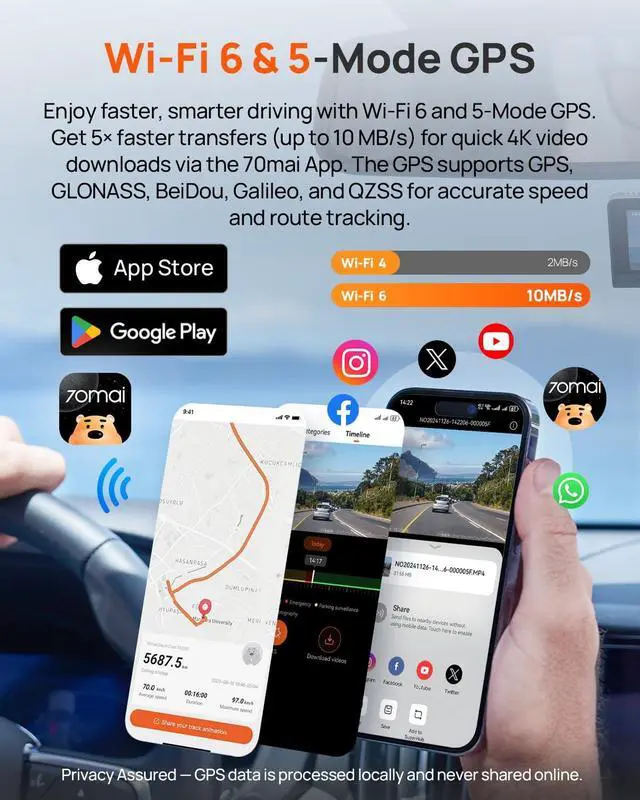 Note: 4G connectivity is not supported ^^ Built-in 5-Mode GPS, Wi-Fi 6 & Smart Voice ControlThe 70mai dash camera for cars features built-in 5-mode GPS for ultra-accurate location, speed, and route tracking. Equipped with Wi-Fi 6, file transfer through the 70mai App is up to 5 faster than standard Wi-Fi 4, reaching speeds up to 10 MB/s. Hands-free voice control lets you take photos, start recording, or lock important footage, making driving safer and more convenient ^^ Easy Installation + 64GB SD Card Included, Supports up to 512GBThis dash cam front and rear inside features a simple adhesive mount and plug-and-play setup for effortless installation. It comes with the RC21 rear camera (Type-C interface) and a 64GB SD card for continuous loop recording no need for manual deletion. Supports up to 512GB SD card for extended recording, making it perfect for daily commutes, Uber/Lyft rideshare, or semi trucks ^^ Super Capacitor for Extreme TemperaturesThe 70mai dash cam front and rear inside is equipped with a super capacitor, ensuring stable performance in extreme temperatures from 14F to 140F, eliminating the risks associated with lithium batteries ^^ Easy Installation & Local SupportDesigned for quick, user-friendly installation that even beginners can complete in minutes without professional help.