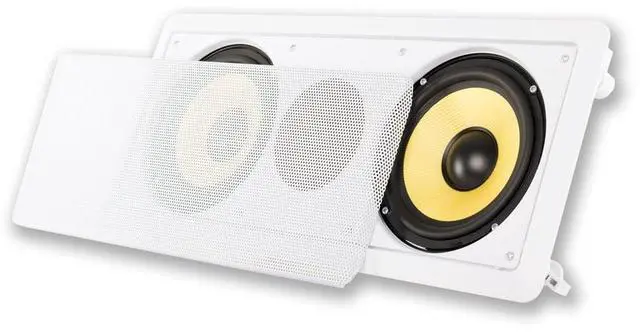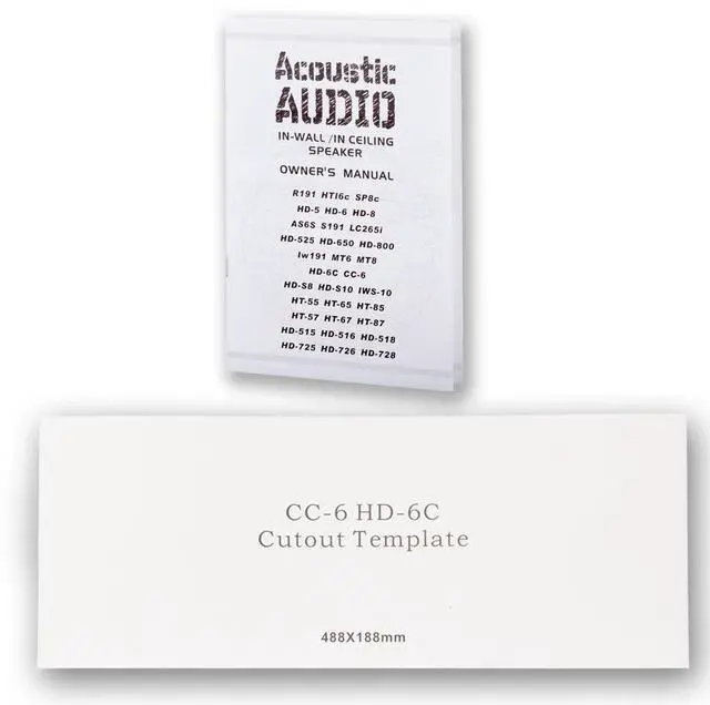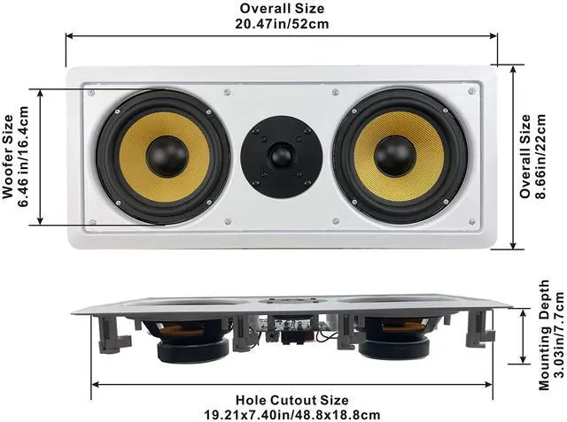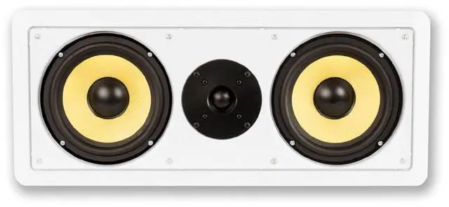 Product Description Acoustic Audio by Goldwood HD6c Flush Mount In Wall Center SpeakerCenter Channel Designed Speaker easily integrates with new and existing audio systemsTraditional Passive speaker design, simply drive power from your home audio receiver or ampFlush Mount low profile housing installs easy with unique Pressure Lock Mounting SystemFull Range sound coverage with Dual Woofers and Tweeter configuration 6.5" Woven Fiber bulletproof cone woofers with butyl rubber surrounds12mm soft dome tweeterFrequency response is 33Hz-22 kHz with 98dB at 8ohmPressure Lock Mounting System clamps tight to drywall with No Hardware NeededFits rectangular speaker hole size of 19.25" x 7.5" with a mounting depth of 3.25"O verall speaker size of 20.5" x 8.75" with Spring Loaded raw wire connectionsDurable ABS Housing and Removeable Grill can be painted to match your decorSystem RequirementsAny home audio receiver or amplifier with raw speaker wire outputsYour receiver power should be no less than 10 and no more than 350 watts per channelCL3 Rated in wall certified raw speaker wire to connect your receiver to the speakerApplicationsHome Theater Surround Sound SystemsWhole House Audio SystemsBusiness or Retail InstallationsWhat's in the box1 Flush Mount Passive Speaker with Removeable GrillCut-Out TemplateInstruction Manual