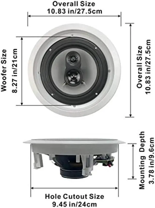 • EASY TO INSTALL - Pressure lock mounting system clamps tight to drywall, fits round speaker hole size of 9.45" with a mounting depth of 3.78", overall size of 10.83" with spring loaded raw wire connections, durable ABS housings and grills can be painted to match your decor