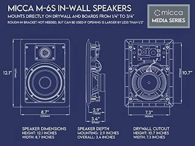 The Micca M-Series of in-wall and in-ceiling speakers have been designed for optimal performance in a wide variety of home entertainment applications, from providing relaxed background music to a high-impact 7-channel home theater system. Built with high-quality components and rigorously tested design, M-Series speakers deliver exceptional value and are well reviewed by owners and critics.
