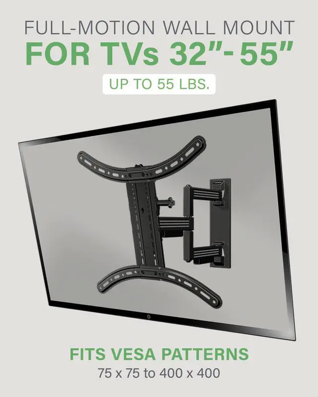 Universal Compatibility: This full motion TV mount fits screens 32" to 55" up to 55lbs from your favorite brands like Samsung, Vizio, TCL, LG and more.