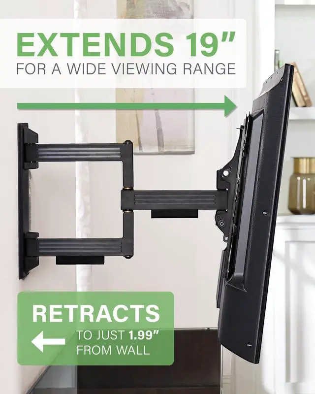 Extend & Swivel: Pull out your screen up to 19" from the wall, unlocking 50 degrees of swivel left and right to give the best view from any seat in the room. Done with your show? Simply push your TV back against the wall for a 2" low profile, flush finish.