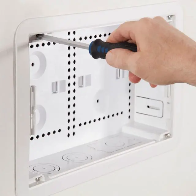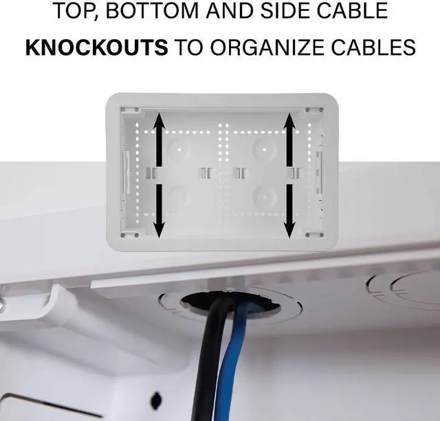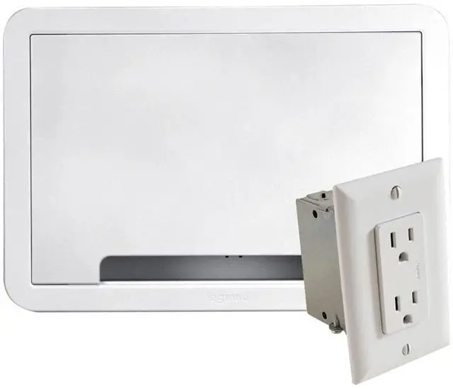 The 9-in TV media in-wall box with power supply kit is ideal for concealing and organizing media devices and power in wall to create a sleek, finished look. The perfect solution directly behind any wall mounted TV to store streaming devices like Apple TV, Roku, Fire TV, network switches and more. Featuring an included power supply kit to bring power to TV and other mounted devices. Constructed of Wi-Fi transparent material to manage wireless components with cable knockouts to help organize cables. Complete solution - Includes box, trim ring, cover, hook and loop strap, extra mounting plate, junction box and outlet, instructions and cut-out template.