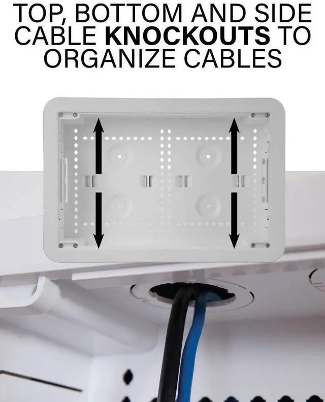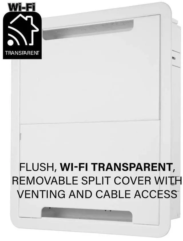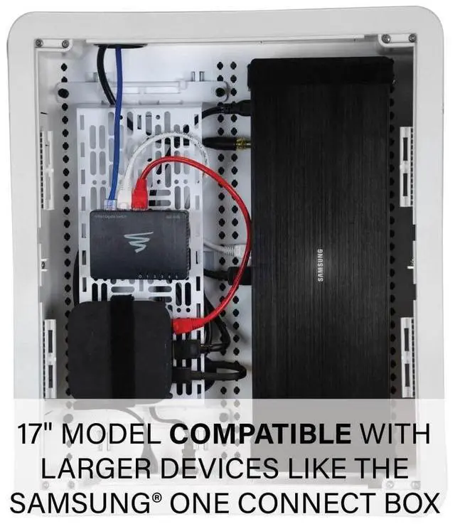 The 17-in enclosure is fits larger devices as well including the Samsung One Connect box. Place in wall behind any wall mounted TV for a sleek, clean entertainment space. Power knockouts allow you to install power for TV and mounted devices. Includes box, trim ring, cover, hook and loop strap, extra mounting plate, complete instructions and cutting template. Versatile split cover snaps into place & supports removal even when partially hidden or obstructed Multipurpose functionality allows you to use for structured wiring organization in other areas of the home.