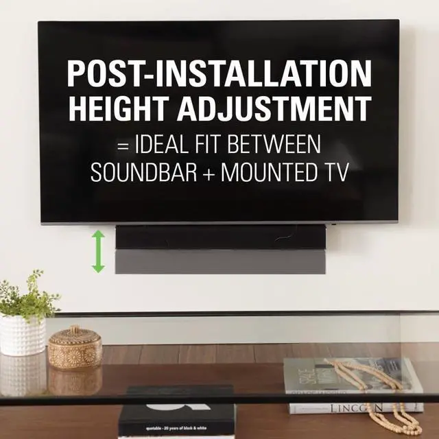 Versatile, the post installation height & depth adjustment allows you to customize your listening setting. The clever design facilitates the accommodation of sound bars with or without up-firing drivers. In addition, the quick release cords let you control the amount of space between your soundbar speaker and your TV.