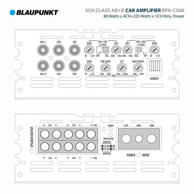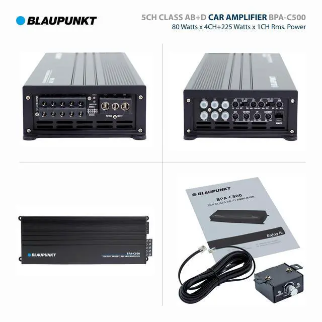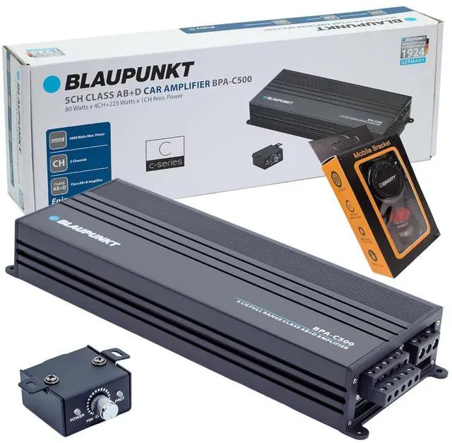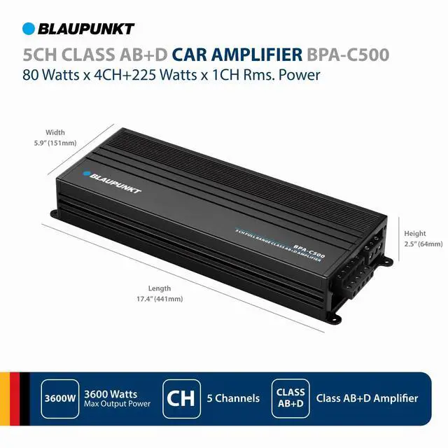 BLAUPUNKT BPA-C500 Elite Car Audio Class AB + Class D 5-Channel 3600W Stereo Amplifier ^^^^ CAR AMPLIFIER - BLAUPUNKT BPA-C500 is a 5-channel Class AB car amplifier designed to deliver exceptional audio performance in your vehicle. The amplifier has a wide frequency response (20Hz to 20kHz) for reproducing deep bass + crisp highs. ^^^^ POWERFUL - It boasts a maximum power output of 3600W, ensuring powerful and nuanced sound reproduction. With 5 channels, it offers versatility in your car audio setup, allowing you to power main speakers, subwoofers, and more. ^^^^ COMPACT - Its compact design allows for easy integration into your car's audio system, promising an immersive and high-quality listening experience.