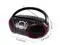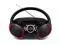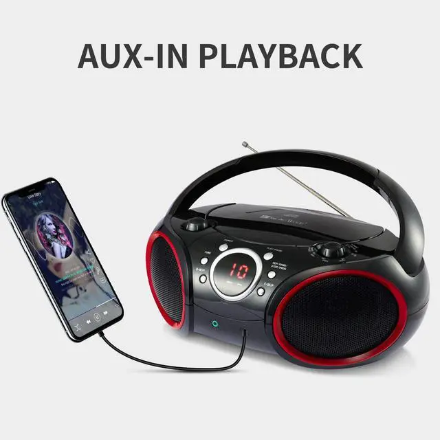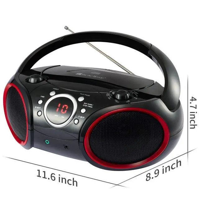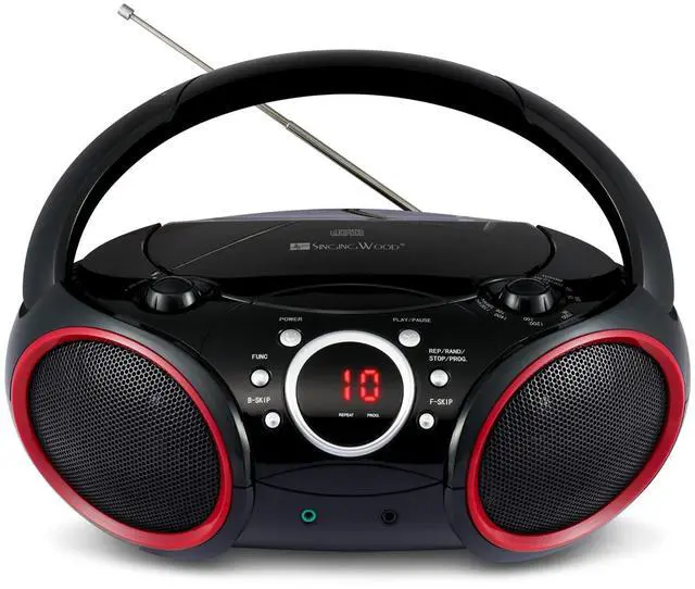 SINGING WOOD SBX030C Portable CD Player Boombox with AM/FM Stereo Radio, Aux Line-in, Headphone Jack, Top-Loading Disc Player, AC or Battery Powered, Foldable Handle (Black with Red Rims)