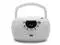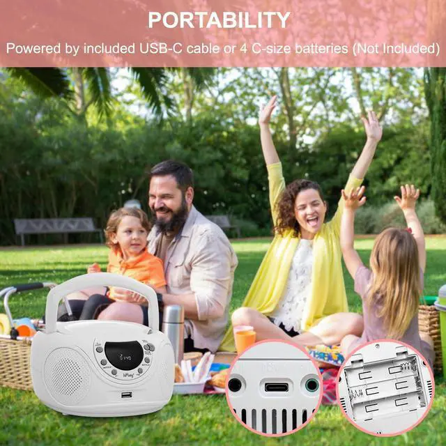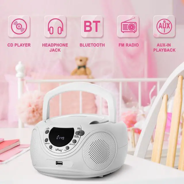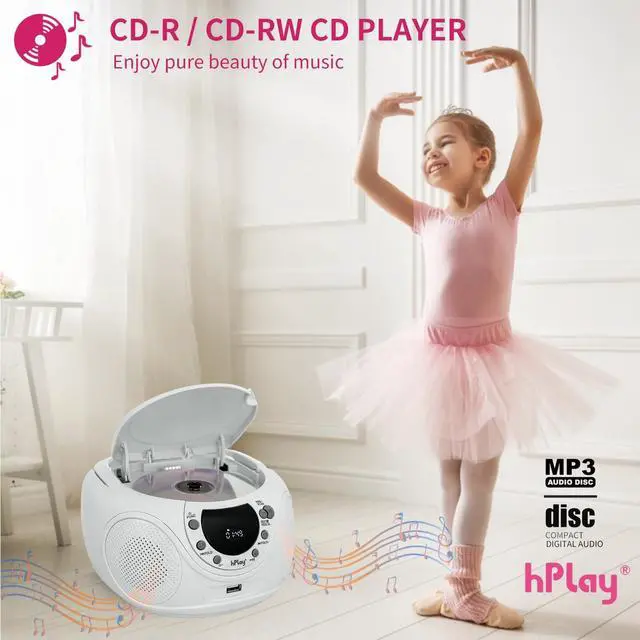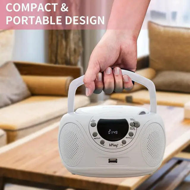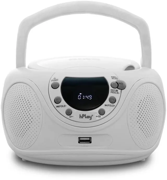 Enjoy your music with the hPlay CD player boombox with AM/FM radio. Convenient foldable carrying handle, this portable CD player boombox includes a top-loading CD tray (CD-R/CD-RW compatible), LCD Display, AM/FM Radio, 3.5 mm aux-in & headphone jack. The boombox can be powered on by an AC cord or 6x C cell batteries. Compact design & impressive sound, it is perfect for home or on the go. Use the AC cord for unlimited listening wherever an outlet is, or add 6x C Cell batteries on the go.