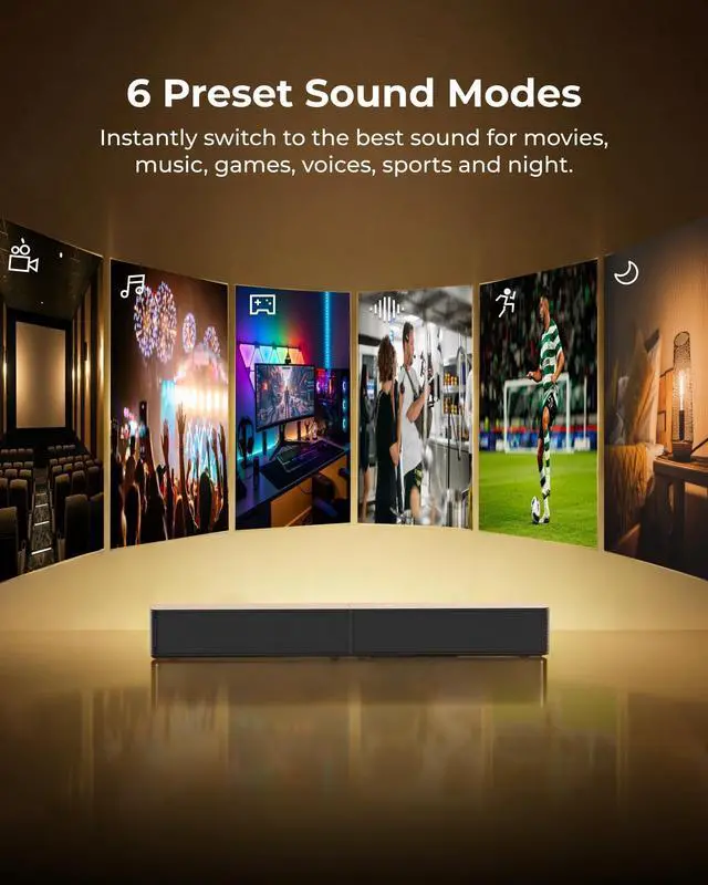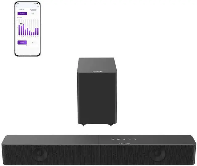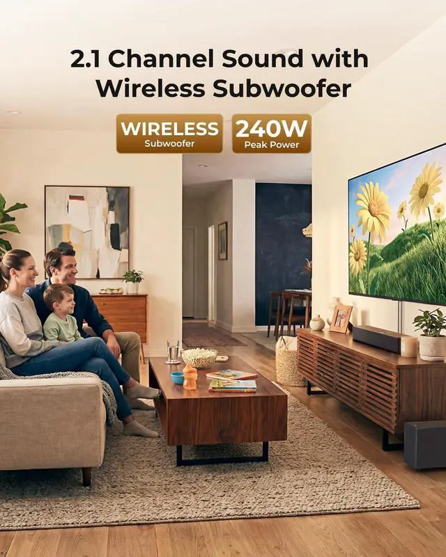 Channel System: Featuring a precision-tuned soundbar and a dedicated wireless subwoofer, the system delivers up to 240W of peak power for room-filling sound. With a frequency response of 45 Hz18 kHz and a maximum SPL of 95 dB, it reproduces clear dialogue, detailed mids, and impactful bass for movies, music, and gaming. ^^ Smart App Control with