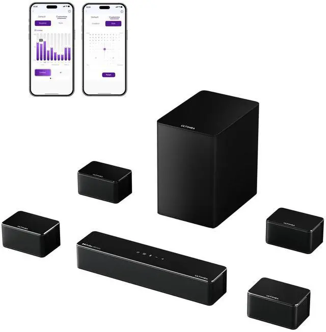 ^^ Precision Audio Tuning: With 121 expert EQ presets across genres like Bass, Pop, Classical, and Rock, plus 10-band and 6 tailored modes (Movie, Music, Voice, Sport, Game, and Night), this TV sound bar allows you to fine-tune audio to your preferences. The ULTIMEA Apps "Customize" feature ensures that your sound bar with subwoofers delivers the perfect balance of treble, bass, and mids in any setting.