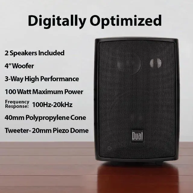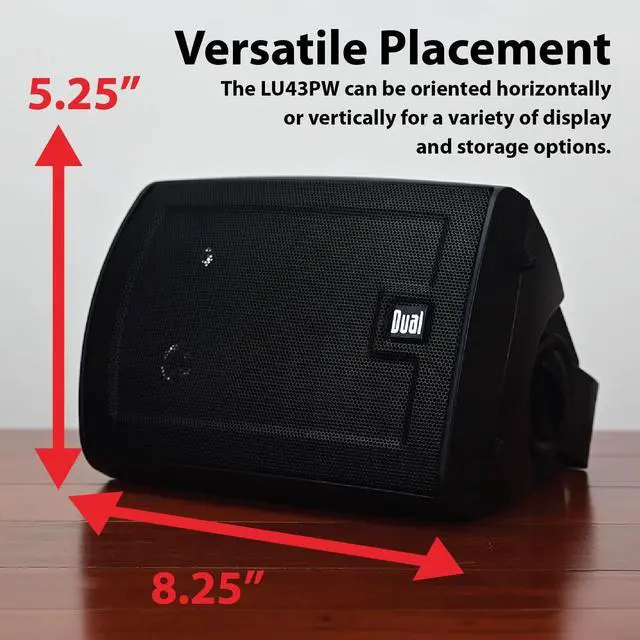 DESIGNED TO LIVE INDOORS & OUTDOORS - These studio quality speakers can be mounted/placed in any open space: by the pool, under your patio, in the garage, on a bookshelf; regardless of placement they will deliver extraordinary sound. ^^ DIGITALLY OPTIMIZED FOR EXPANSIVE DISPERSION & POWERFUL BASS The synchronized harmony of your 3-Way Component Speakers & 4-inch Woofer create a state of accurate acoustic dispersion with deep rich sounding bass for a truly full range of sound. ^^ ALL WEATHER RESISTANT COATING These speakers are made for every season. They are coated with a UV resistant resin and placed inside an ABS enclosure protecting it from the elements and preserving sound integrity. ^^ DUAL DBTMA100 BLUETOOTH AMPLIFIER (SOLD SEPARATELY) Dont forget to add the top selling Dual Electronics DBTMA100 Bluetooth Amplifier with your LU43PB Speakers for the best outdoor/indoor acoustic experience. ^^ 2 YEAR WARRANTY - When registered online with Dualav dot com. 1 year warranty standard.