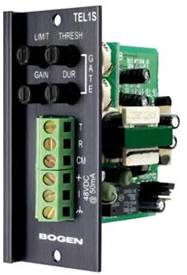 Bogen TEL1S Telephone- Advanced Input Module, Dry Loop Interface to Paging Ports, Audio-activated Paging, Gain/Trim Control, Limiter, Noise gate w/Threshold & Duration, 4 Priority LevelsThe TEL1S module is a transformer-isolated, balanced input and configuration jumper that will allow it to interface with both wet and dry loop telephone systems. In the dry loop mode, this module allows connections to page port systems. In the wet mode of operation, it allows connections to both ground start and loop start telephone systems. The module provides for the connection of an external talk-battery power supply of 48V DC.