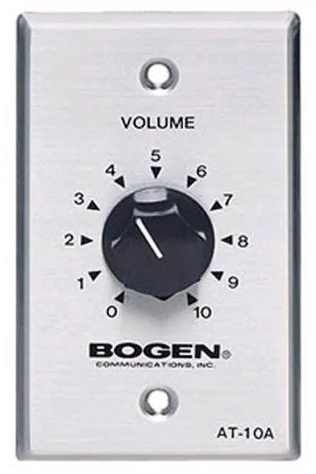 Bogen AT10A Speaker Attenuator, 10 Watts, 10 Step Volume Control, 25V/70V System, Wall Mount Single Gang, Adjustable Audio Level Attenuator, Attenuation in 3 dB IncrementsThe Bogen AT10A 10 Watt Speaker Attenuator is a control device that lets you adjust speaker output levels on a 25V or 70V distributed audio system without changing the main amplifier volume. It fits in a single gang electrical box and provides 10 discrete attenuation steps plus an off position, giving installers precise control over local loudspeaker zones in commercial or institutional audio installations.