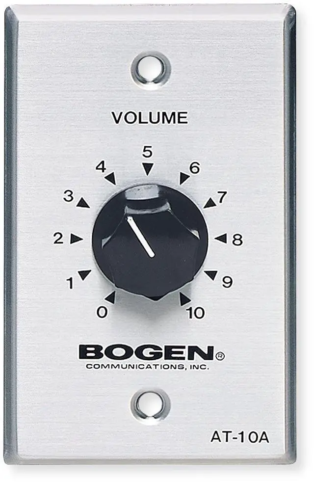 Bogen AT10A Speaker Attenuator, 10 Watts, 10 Step Volume Control, 25V/70V System, Wall Mount Single Gang, Adjustable Audio Level Attenuator, Attenuation in 3 dB IncrementsThe Bogen AT10A 10 Watt Speaker Attenuator is a control device that lets you adjust speaker output levels on a 25V or 70V distributed audio system without changing the main amplifier volume. It fits in a single gang electrical box and provides 10 discrete attenuation steps plus an off position, giving installers precise control over local loudspeaker zones in commercial or institutional audio installations.