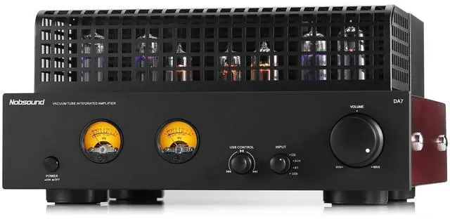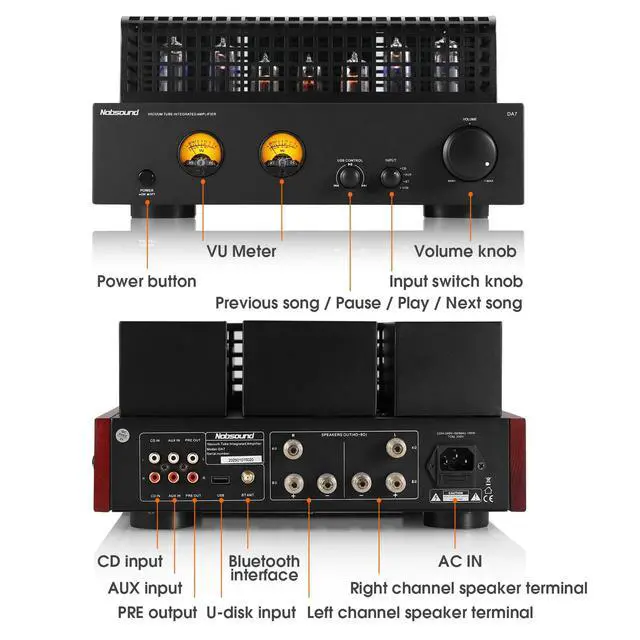 Tube Power Amplifier Classic all-tube path with 46P1 power tubes + 36N1 drivers for warm, natural timbre and rich dynamics; rated 12W2 @4 (8W2 @8). AC 110V input with US plug. ^^ Bluetooth Dual-mode 5.3 / 5.0 wireless input pairs fast and stays stable for streaming from phones, tablets, or laptops; convenient front selector knob lets you switch sources instantly. ^^ USB Playback USB-A (U-disk) input supports up to 128G, FAT32/ExFAT, and MP3/WMA/APE/FLAC/AAC/WAV so you can play local files directly without a separate player. ^^ Dual VU Meters Two responsive analog meters visualize output swing in real time, adding classic studio aesthetics while helping you monitor levels at a glance.
