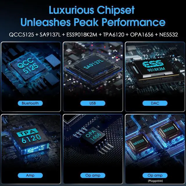 Luxurious Chipset Unleashes Peak Performance: The QCC5125 Bluetooth chip supports APTX-HD and LDAC, achieving the highest 24Bit/96Khz transmission. The SA9137L USB chip and ESS9018K2M DAC chip handle PCM data up to 384KHz/32Bit and DSD256. The TPA6120 amp chip effortlessly powers headphones ranging from 16 to 600 with an output power of up to 750mW. Additionally, two pluggable NE5532 op amps allow you to tailor your sound by swapping with various dual op-amps. ^^ Authentic Tube Amplification and