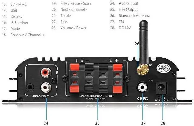 The Latest LP-269S amplifier chip provides efficient, 4-channel sound output; Low distortion; Low noise; Good sound quality ^^ Multiple audio inputs, audio-visual product of CD/DVD/USB/SD/FM/MP3 etc. ^^ Support Bluetooth Hi-Fi wireless connection user top British brand CSR 4.0 Bluetooth module, ensuring high-quality audio transmission. ^^ Compact size and lightweight, sturdy aluminum alloy enclosure; Ideal for car, motorcycle, MP3, computer speaker and other audio applications.