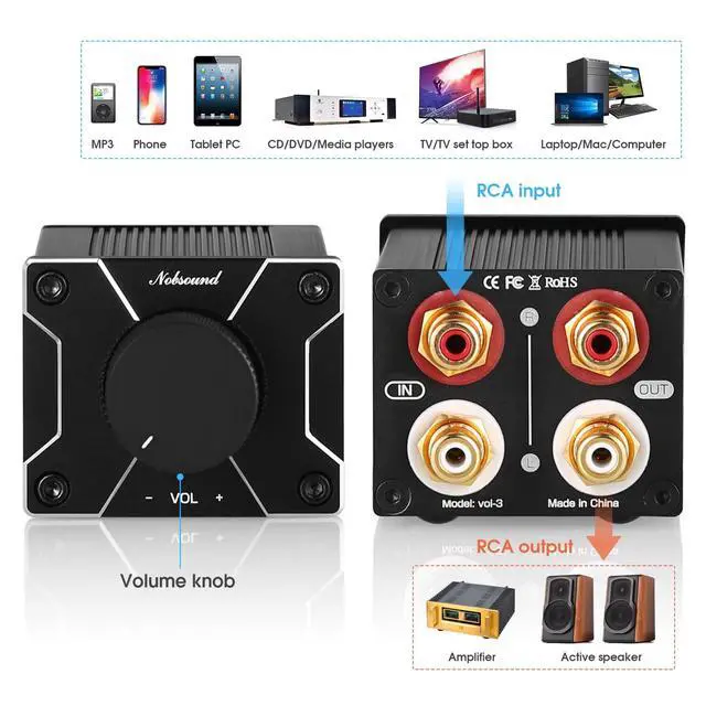 Passive preamp with no gain: Designed without built-in gain, the passive preamp is suitable for connecting to HiFi PC sound card, DAC and CD players with high output signal, as well as active speakers and pure power amplifiers with high gain themselves.