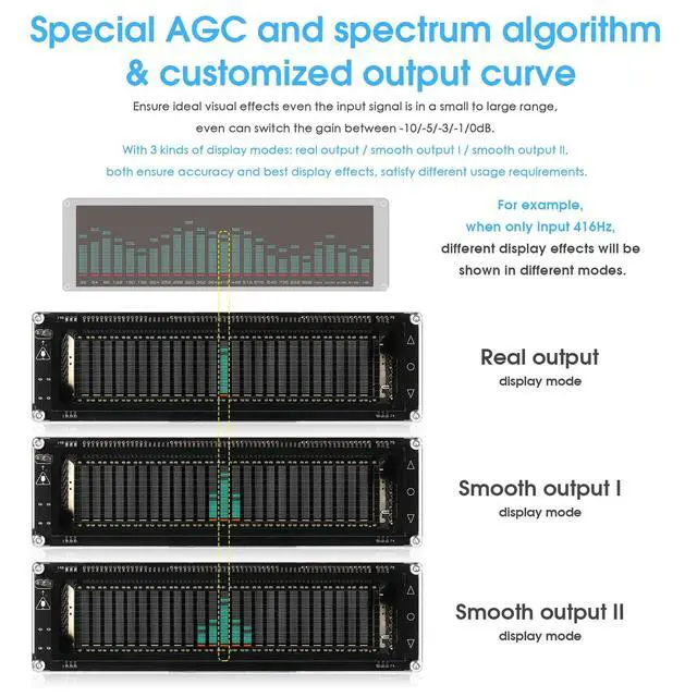 Display Modes: The AK2515 features a special AGC and spectrum algorithm for optimal visual effects across a wide range of input signals. Switch between -10/-5/-3/-1/0dB gain settings and choose from three display modes (real output, smooth output I, smooth output II) to meet your specific needs. ^^ Extensive Customization and