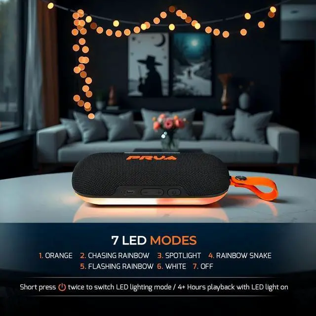^^ DYNAMIC LED LIGHTING - Integrated LED light bar with multiple modes adds visual flair to your music experience, perfect for parties, camping, or relaxing evenings. Parlante o bocinas bluetooth con luces. ^^ EXTENDED BATTERY LIFE AND TWS PAIRING - Powered by a 3500mAh battery, enjoy up to 10 hours of continuous playtime. Utilize True Wireless Stereo (TWS) to pair two small speakers bluetooth wireless for a wider soundstage.