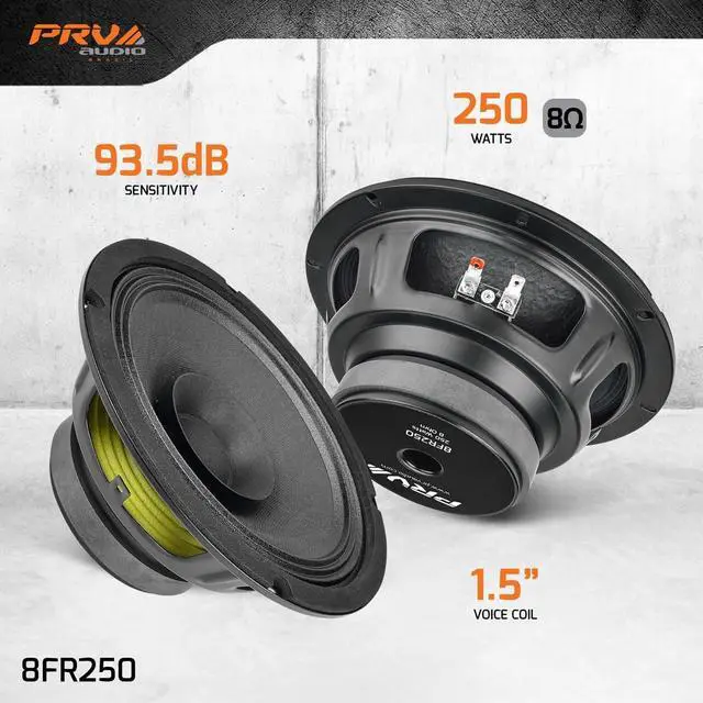 The PRV Audio FR Series sets a new standard of value in high-performance Full Range drivers. The 8FR250 full-range driver is an excellent choice when space is at an absolute minimum, eliminating the need for a tweeter. This loudspeaker has a dual cone design, the primary cone handles low to midrange frequencies while the smaller secondary cone increases high-frequency response from 50 Hz to 18, 000 Hz. The combination of a low-distortion motor system with a copper ring and a unique woven-cloth dust cap provides exceptional clarity, detail, and dynamics at an impressive 93.5 dB of sensitivity.