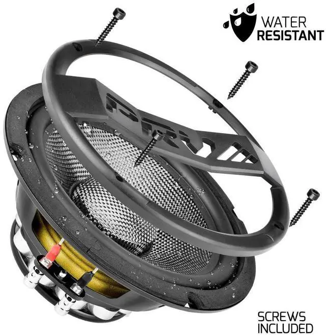 The 8MR500CF-NDY speaker is designed for Power sports applications, featuring a water-resistant design to ensure optimum performance taking into account the effects of the outdoor environment! Ideal for upgrading your sound system in your boat, UTV, 4-wheeler, or motorcycle, this mid range speaker becomes the new standard in vocal reproduction for outdoor applications. Constructed of high-end materials like a carbon fiber cone, high-temperature voice coil, and huge neodymium magnet, this driver produces natural sound with remarkably low distortion. Water Resistant with true PRO audio midrange performanceDamped carbon fiber cone lowers moving mass and minimizes unwanted resonancesLow inductance and extended frequency responsePowerful neodymium magnet structure features distortion-canceling fixturesFast transient response, minimal tonal coloration, and deep, dynamic midbassSold in pairs Grill and screws are includedThe suspension design of this midrange features the single layer spider which connects to the coil former with premium stitched lead wires, all being driven by a copper-clad aluminum wire voice coil providing high efficiency and excellent power handling, complemented by a high-power neodymium radial slugs that immerse the voice coil in a strong magnetic field.