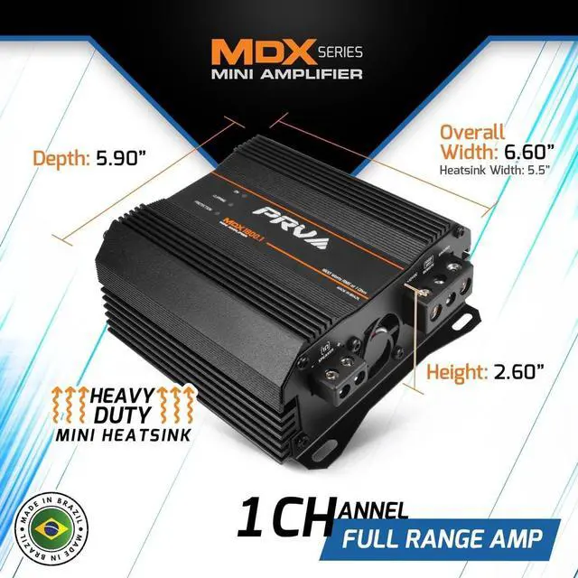 Sizing: 6.60 Width by 5.90 Length and only 2.60 Height. ^^ Its wide frequency response allows you to use it in many different applications, such as midbass, midrange, full range speakers, phenolic drivers, titanium drivers, and super tweeters, among others. ^^ The MDX 1800.1 Amplifier is ideal for motorsport applications such as custom motorcycles, ATVs and Slingshots! ^^ Compact and