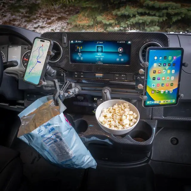 Mount your favorite dashboard devices and accessories on the NEXUS DashTrack for your VS30 Mercedes-Benz Sprinter Van or conversion such as Winnebago Revel, Storyteller Overland or Jayco Terrain. The track mounts to a set of two NEXUS Cubby Adapters and installs in minutes with no screw holes or other alterations to the van required. Durable black extruded aluminum ball mounting track with endcaps included. T-Bolt track balls (not included) maybe be easily added or removed after installation for endless mounting possibilities. Foam padding protects the dashboard surface beneath the track. Adapters fit the latest VS30 Sprinter Vans (2019 or later) or Sprinter conversions such as Winnebago Revel, Storyteller Overland or Jayco Terrain with cubby opening measuring 9.5 x 2.7 cm.