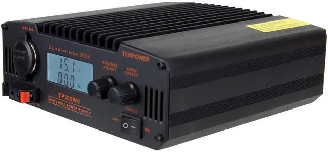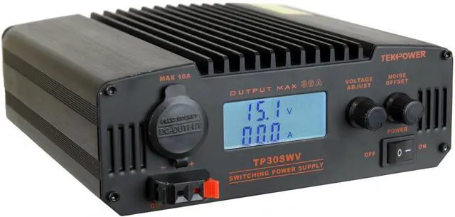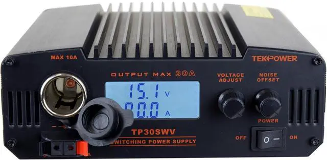 TekPower TP30SWV 30 Amp DC 13.8V Switching Power Supply with Noise Offset The TekPower TP30SWV is a professional Digital DC power supply for powering many devices such as Ham/CB radio and amplifiers. It is a highly stable, fused, high quality switching power supply with 13.8V fixed, 9-15V adjustable DC power output, and 30A max current. It has a main DC output on the back of the unit, a cigar socket, and a snap in output on the front. It has excellent line and load regulation, low ripple and noise.
