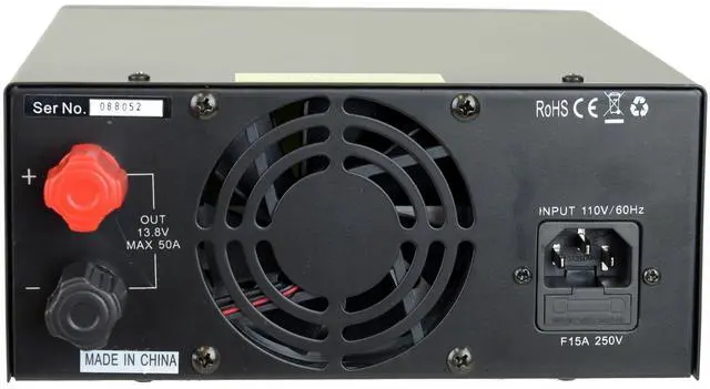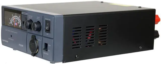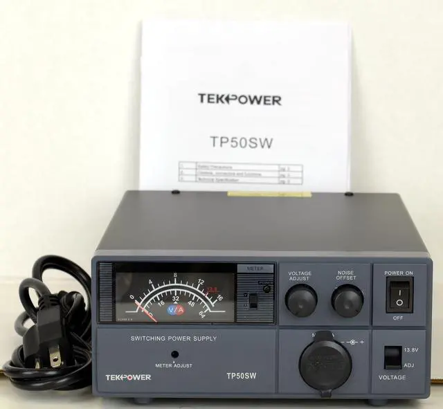 The TekPower TP50SW is a professional DC power supply for powering many devices such as Ham/CB radio and amplifiers. It is a highly stable, fused, high quality analog switching power supply with 13.8V fixed, 9-15V adjustable DC power output, and 50A max current. It has a main DC output on the back of the unit and a cigar socket on the front. It has excellent line and load regulation, low ripple and noise designed for communication equipment uses. It has many safety protection such as overload protection and short circuit protection.