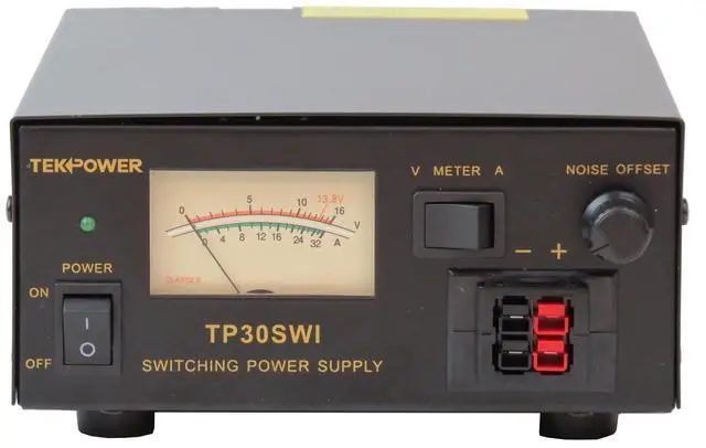 The TekPower TP30SWI is a professional analog DC power supply for powering many devices such as Ham/CB radio and amplifiers. It is a highly stable, fused, high quality switching power supply with 13.8V fixed DC power output, and 30A max current. It has a main DC output on the back of the unit and a snap in output on the front. It has excellent line and load regulation, low ripple and noise. It is designed to minimize switching noise specifically for communication uses. When there is noise, you can use the noise offset knob to eliminate it.