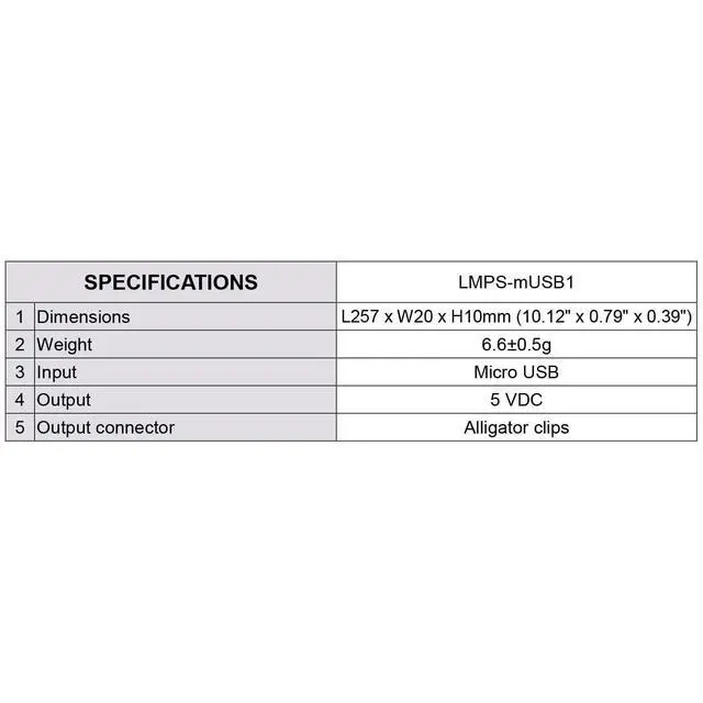 Micro USB connector power input. Output 5 VDC with alligator clips. ^^ Designed for all Quarton Laser Modules that require 3-6V operation Voltage.