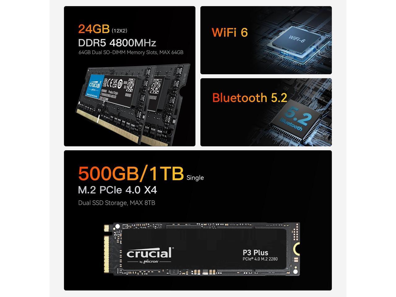 • 24GB DDR5 & 500GB PCIe4.0 SSD: EQR6 mini pc comes with 24GB DDR5-4800MHz RAM (12GB * 2, dual-channel, expandable up to 64GB) a