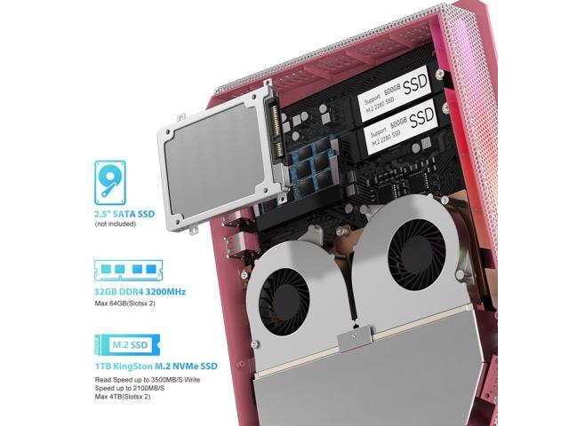 The Mini Gaming computer comes with 16GB DDR4-2666 RAM, up to 64GB (2x32GB), equipped with 1TB M.2 NVMe SSD, you can upgrade your Mini PC with Dual Channel PCIe 3.0 + SATA SSD up to 4TB (2x2TB), support 7mm 2.5-inch SATA HDD slot(not included HDD) to meet your needs. Mini PC Pre-in Windows 11 pro, No Bloatware, boots up in seconds.