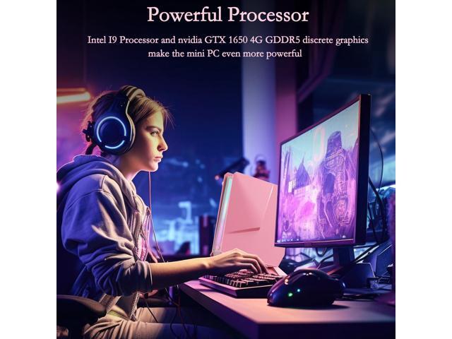 Mini PC i9-9980HK Processor & GeForce GTX1650 GDDR5 Dedicated Graphics Card 8C/16T RGB Lights Desktop Gaming Mini Computer, 32GB RAM 1TB NVMe SSD, 4K Triple Displays/WiFi 6E/BT 5.3, Pink
