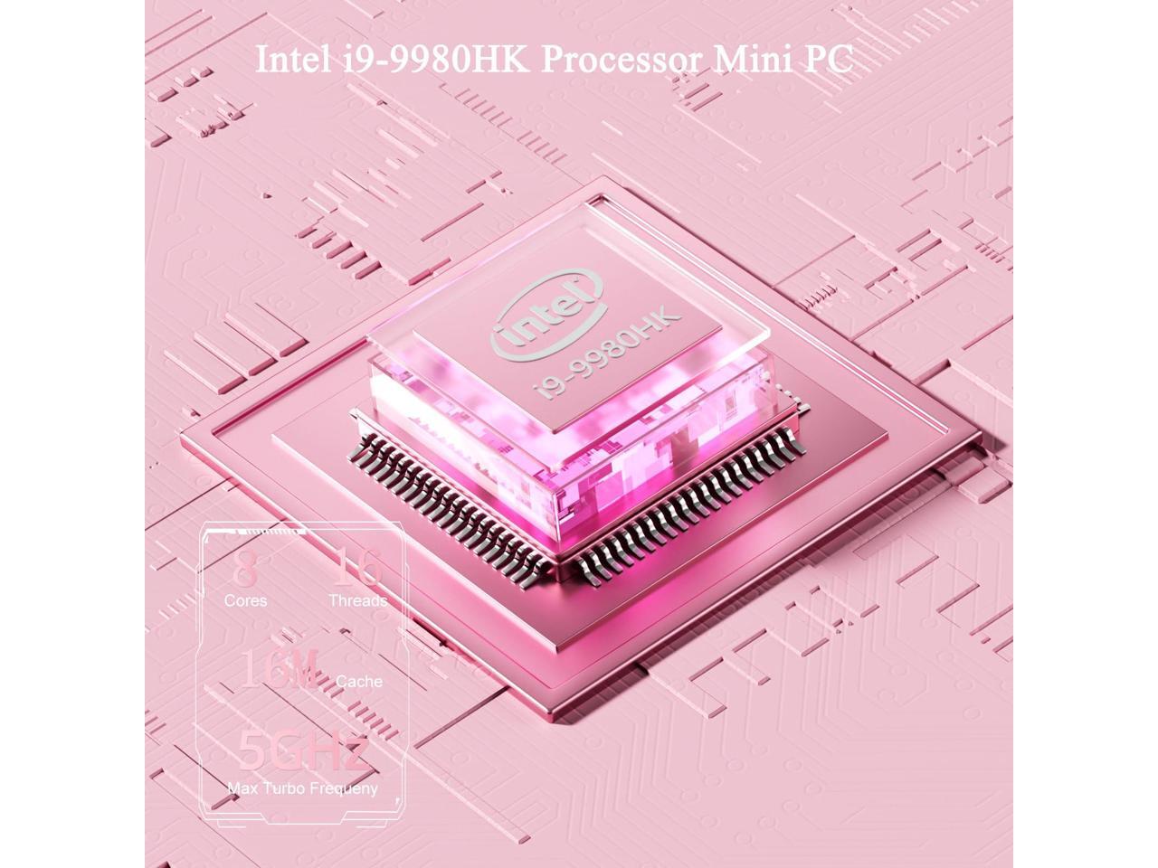 The mini pc is powered by core i9-9980hk Processor, 2.4GHz (4.8GHz Max Boost), 8 cores 16 threads, 16MB Cache, with Intel UHD Graphics 630 and only 1/4 size of desktop computer, this compact and powerful mini computer effortlessly handles your daily work and leisure needs.
