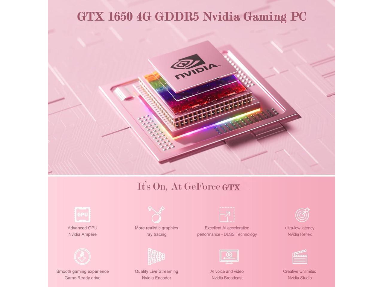 The Pink Gaming PC features GTX 1650 4GB GDDR5 VRAM, 896 CUDA cores and 1485 MHz, the dedicated graphics card provides this gaming pc with more powerful graphic processing capabilities, ideal for light 1080P gaming, office work, TV and more.