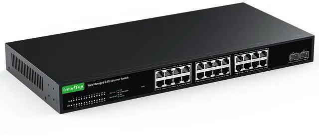 GoodTop 24 Port 2.5G b Web Managed Switch, 24 x 2.5G Port, 2 x 10G SFP+, 160Gbps Bandwidth Smart Managed Network Switch with LACP/VLAN/QoS/DHCP Client, Fanless Metal Ethernet Switch, 1U Rack Mounted