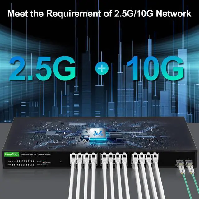 GoodTop 24 Port 2.5Gb Web Managed Switch,24 x 2.5G Port,2 x 10G SFP+,160Gbps Bandwidth Smart Managed Network Switch with LACP/VLAN/QoS/DHCP Client,Fanless Metal Ethernet Switch,1U Rack Mounted