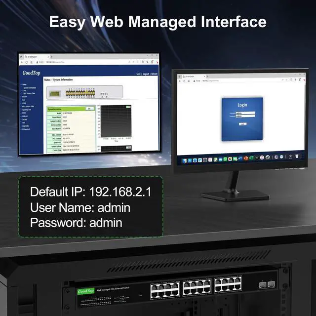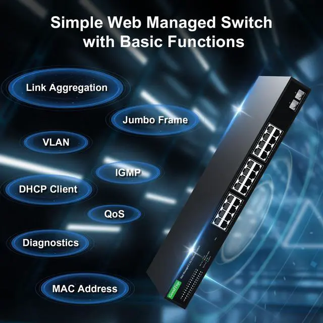 >[(Easy Management Functions)] The switch supports log in via web interface and there are some basic L2 management features for managing the switch.Such as VLAN,LACP,QoS,IGMP Snooping,Jumbo Frame,MAC address,ERPS and etc.Meets the need of daily use of management functions.(Note: Please set IP address of computer via IPV4 first before log in this switch).