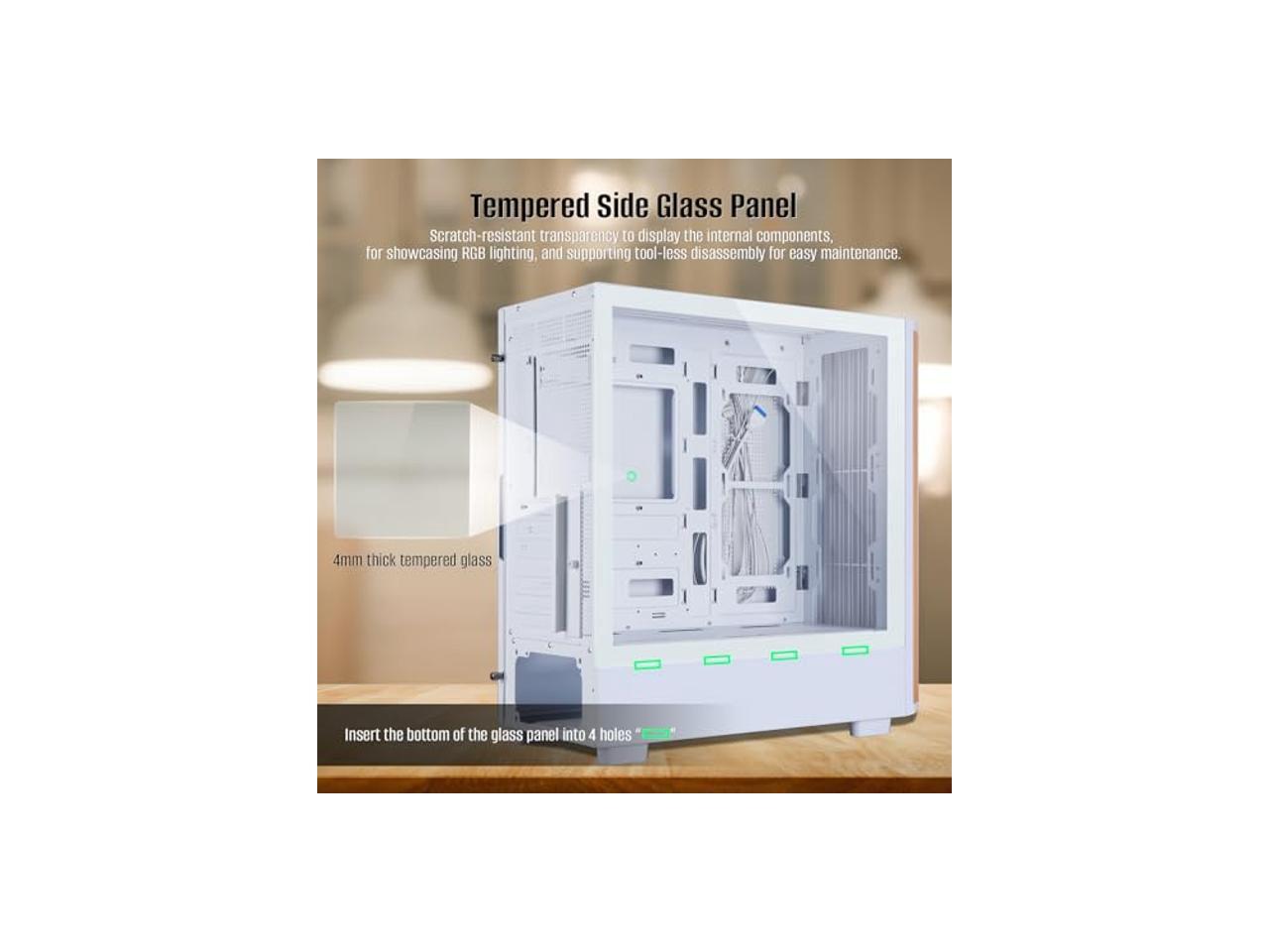 - Tempered Side Glass Panel: The side panel is made of 4mm thick tempered glass, providing scratch-resistant transparency to display the internal components, for showcasing RGB lighting, and supporting tool-less disassembly for easy maintenance.