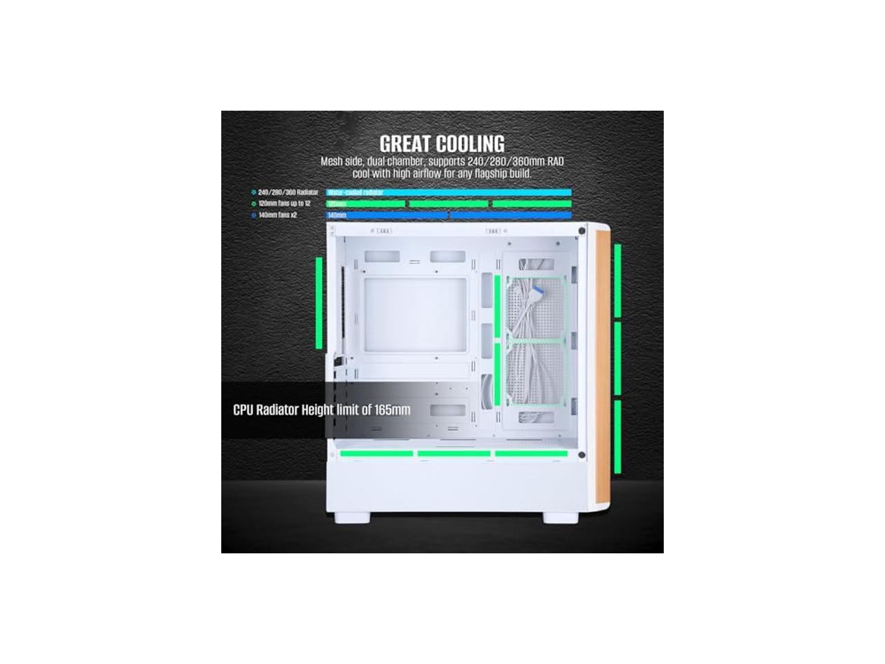 ATX Mid Tower Gaming PC Case - Tempered Side Glass Panel - Dual Chamber - Walnut Wood Front - Can Build in 12 ARGB PWM Fans High Airflow 360MM RAD Supports for ATX/mATX/Mini ITX Motherboards White
