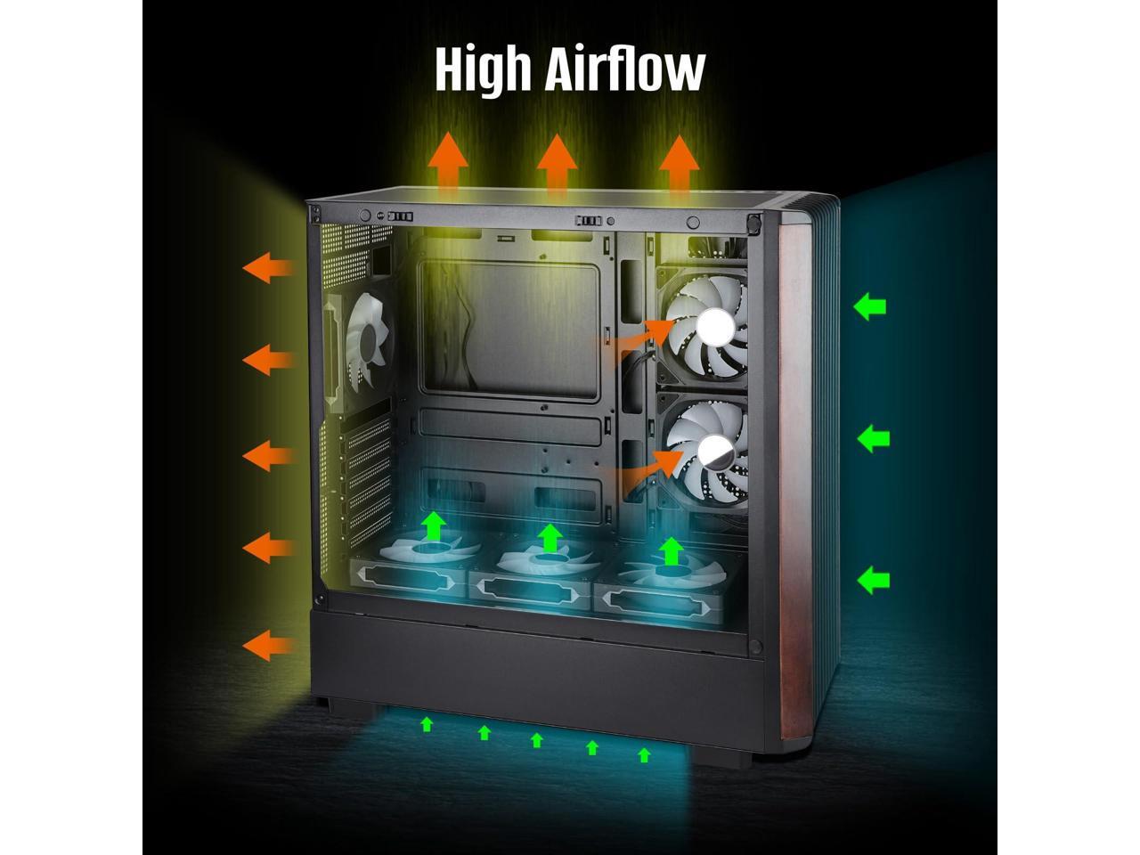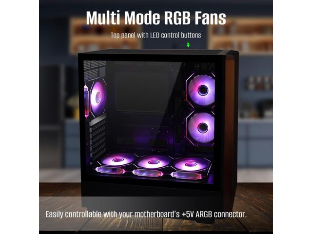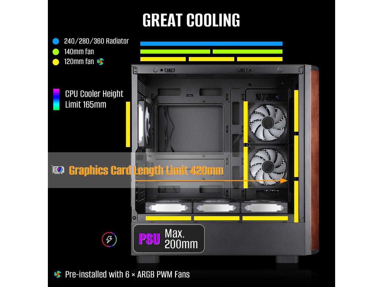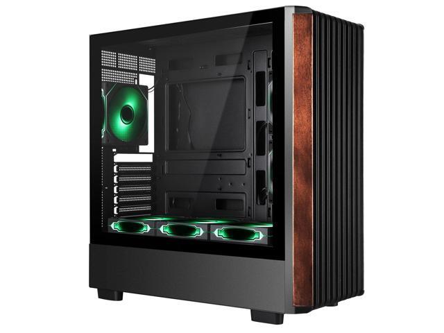 Mid Tower Gaming PC Case ATX Genuine Walnut Wood Front Tempered Glass Side Panel High Airflow Dual Chamber Build in 6 120mm ARGB PWM Fans 360MM RAD Supports for ATX/mATX/Mini ITX Motherboards Black
