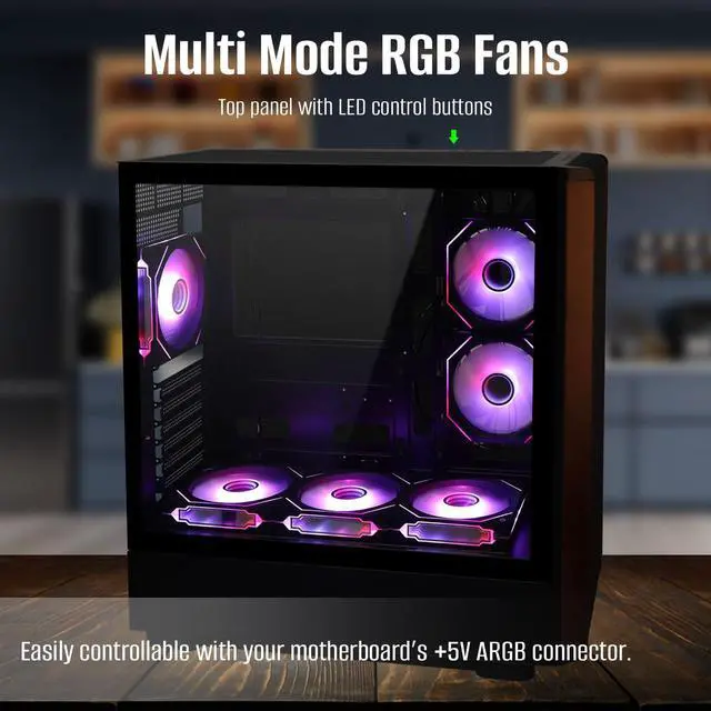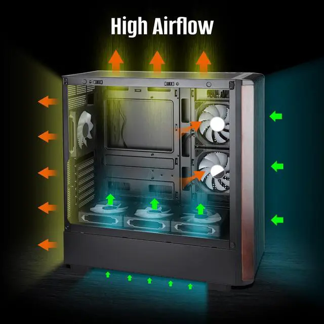 Pre-installed with 6 × ARGB PWM FansTop of power compartment: 120mm*3; Rear panel: 120mm*1; Front side of motherboard: 120mm*2.