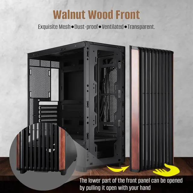 Walnut Wood Front Fusion with SPCC Steel FrameworkWalnut wood with its dark brown to give the chassis retro, warm visual effect, warm touch and modern functionality is characterized by the fusion of aesthetics and practicality.