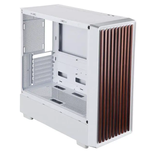 This chassis features a hybrid design combining natural aesthetics and modern functionality. The front panel is crafted from premium walnut wood, providing a warm, organic texture that blends seamlessly with home or office decor. The side panels are made of 4mm-thick tempered glass, offering scratch-resistant transparency to showcase internal components while supporting tool-free removal for easy maintenance.