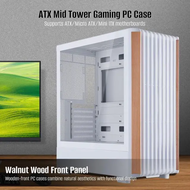 Wood Front Panel: Wooden-front PC cases combine natural aesthetics with functional design, featuring premium materials for a sophisticated, eco-friendly look. Their open-grid wooden panels enhance airflow while maintaining dust resistance. ^^ Fits atx / micro atx / mini itx motherboards; Fits atx psu; Without controller required, one click control of fan lights on the chassis.