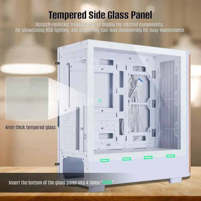 Tempered Side Glass Panel: The side panel is made of 4mm thick tempered glass, providing scratch-resistant transparency to display the internal components, for showcasing RGB lighting, and supporting tool-less disassembly for easy maintenance.